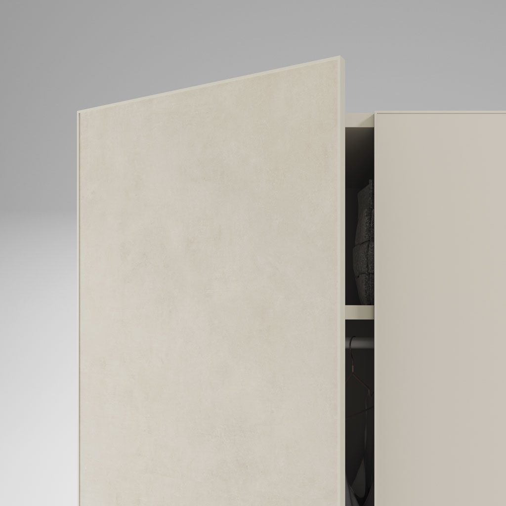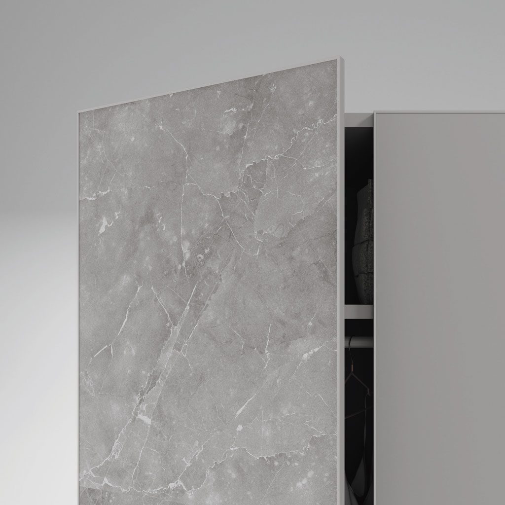 Este es un armario de seis puertas con marco de aluminio, el perfil es muy fino, casi pasa desapercibido. Destacan los cuatro plafones que están en acabado Stone, una novedad del Catálogo Nolimits Next, que simula la rugosidad de la piedra y el mármol y es tendencia en el mercado.