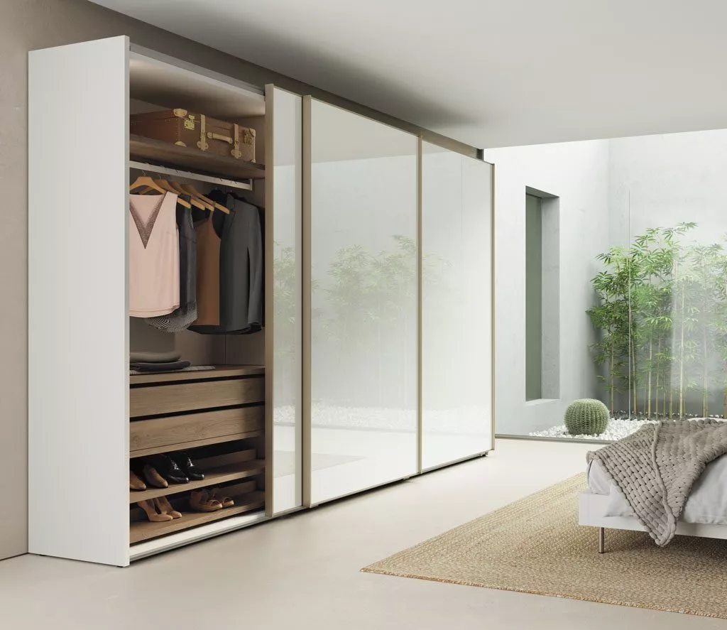 Este armario destaca sobre todo por las puertas correderas exteriores diseñadas con un sistema que permite situar las puertas laterales en un carril distinto al de la puerta central, así estas no se obstaculizan y permiten una mayor facilidad de movimiento.