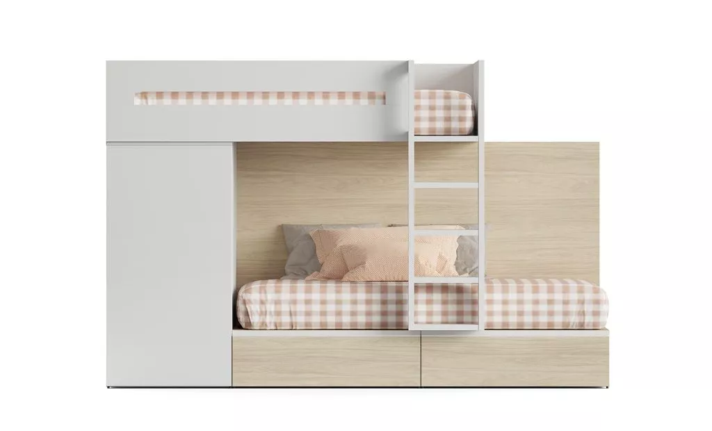 En la zona inferior, si prefieres tener espacio de almacenaje, te proponemos dos o tres cajones. Aunque si las visitas inesperadas llegan a tu hogar, entonces agradecerás tener una cama extra, esta cama con arrastre se sitúa debajo de la litera inferior.