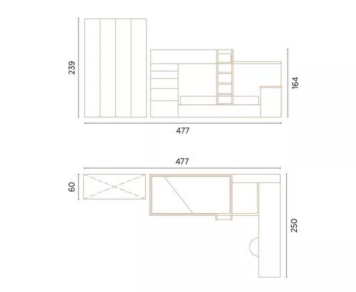 Como puedes observar en la imagen, te proponemos distintas opciones para el color y los acabados, en el ejemplo de la cama con arrastre encontrarás el color Sake en la escalera, en los cajones laterales y en el armario. El color Humo está presente en la balda con soporte oculto, en la trasera y en la cama con arrastre. El acabado Frida lo encuentras en el escritorio. En las opciones con cajones inferiores el acabado Frida está también en la trasera de la litera tren y en los cajones bajos. No olvides que esta es solo una propuesta y que el catálogo Flow pone más colores y acabados a tu disposición para que hagas las combinaciones que más te gusten. La litera tren mide 267 cm de largo, 100 cm de fondo y 203 cm de alto. El armario mide 150 cm de ancho, 60 cm de fondo y 239 cm de alto. El escritorio mide 200 cm de largo, 50 cm de fondo y 75 cm de alto. Somos especialistas en muebles a medida, el límite es tu imaginación, por eso en jotajotape todo es posible