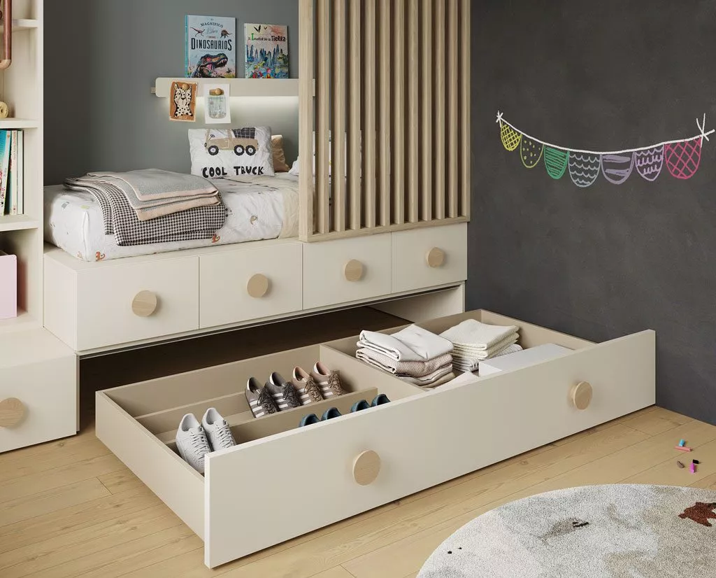 La cama nido tiene 4 cajones inferiores perfectos para guardar ropa interior, pijamas, etc. Justo debajo de estos te presentamos diversas opciones, desde una cama con arrastre, hasta un cajón diáfano o con separadores.