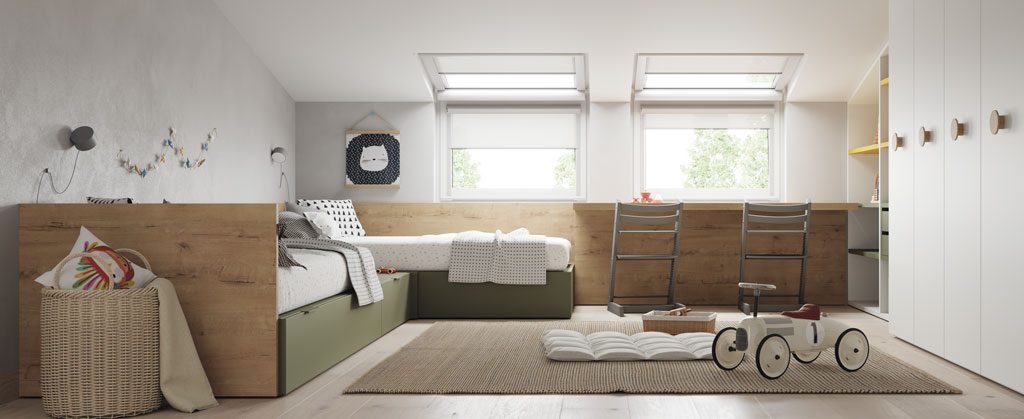 Hemos situado las dos camas en forma de L para optimizar el espacio al máximo, además debajo hay una gran zona de almacenaje, puedes aprovechar cada espacio inferior gracias al módulo esquinero y a los cajones bajos sin zócalo.