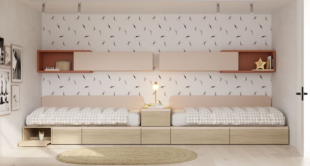 Este dormitorio doble se distribuye en una zona para el descanso que consta de dos camas individuales dispuestas en línea cuyas bases para el colchón son unos cajones bajos de distintas medidas con mucho espacio para el almacenaje.