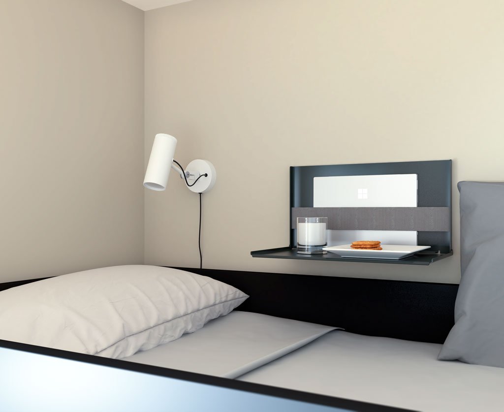 También te mostramos dos opciones de bandejas abatibles que en este caso están en la cama superior, una es con la base metálica y la otra tiene la base de melamina. Las dos disponen de una cincha elástica para sujetar diferentes cosas.