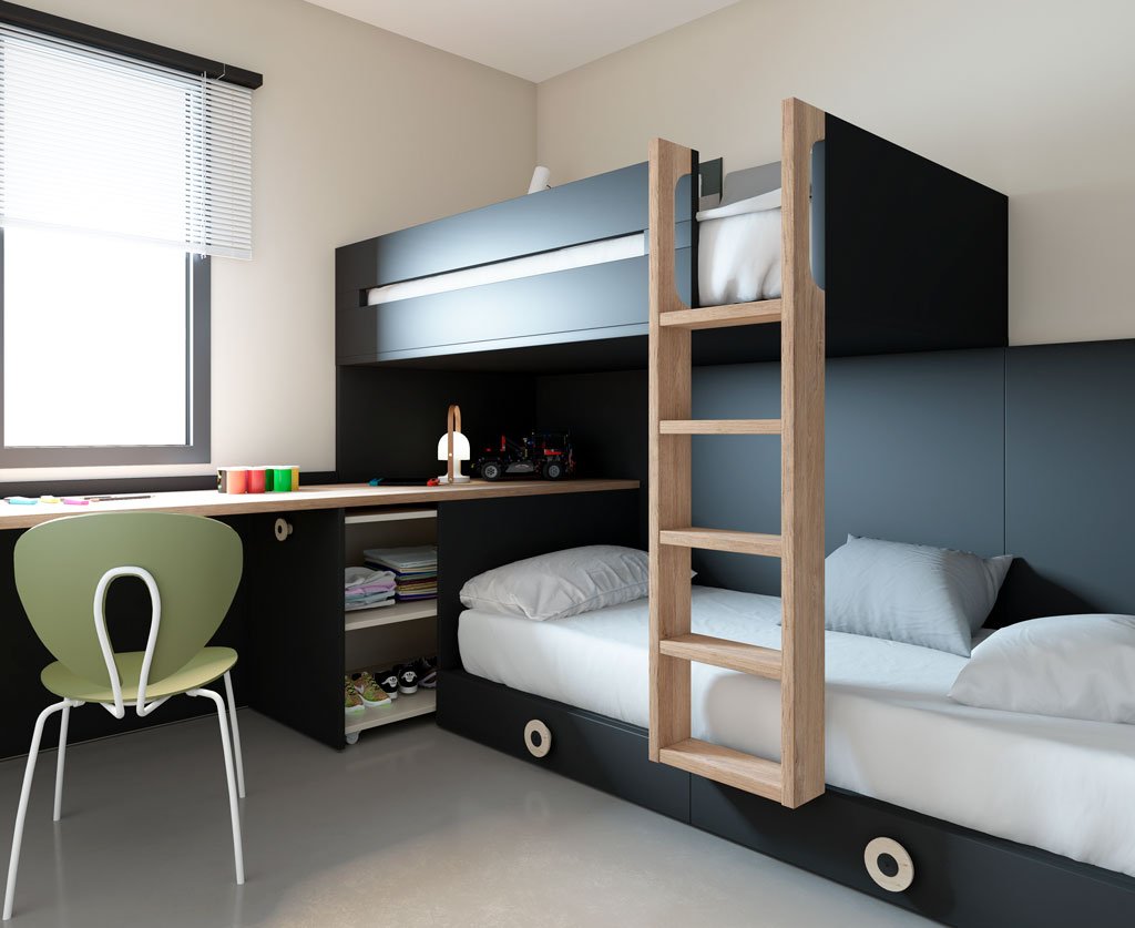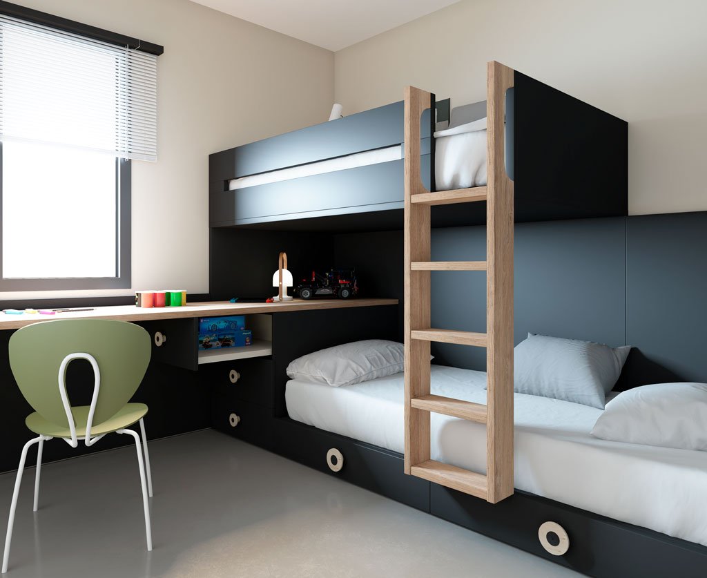 Por una parte, puedes ver la litera tipo tren que juega con los volúmenes para que el escritorio entre dentro de la cama inferior desplazándola hacia la derecha.