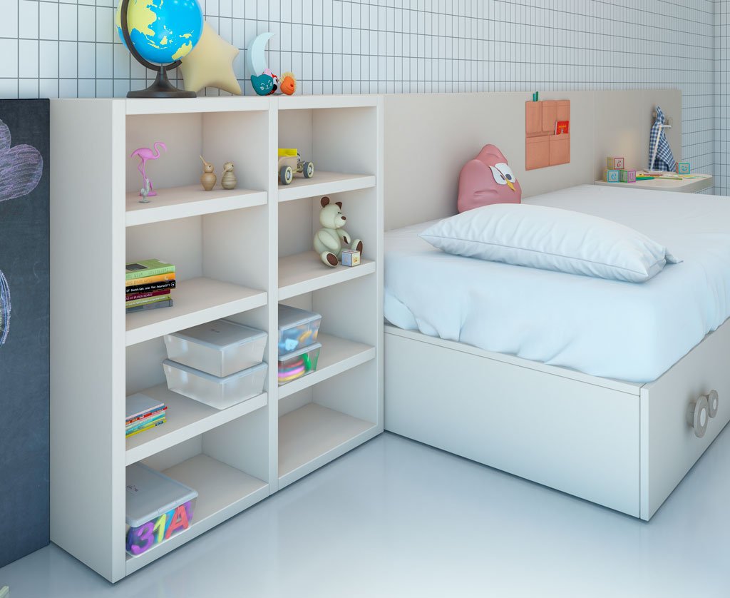Zona de juegos, estantería y dos camas en poco espacio, sin duda es muy funcional para el día a día de tu hij@.