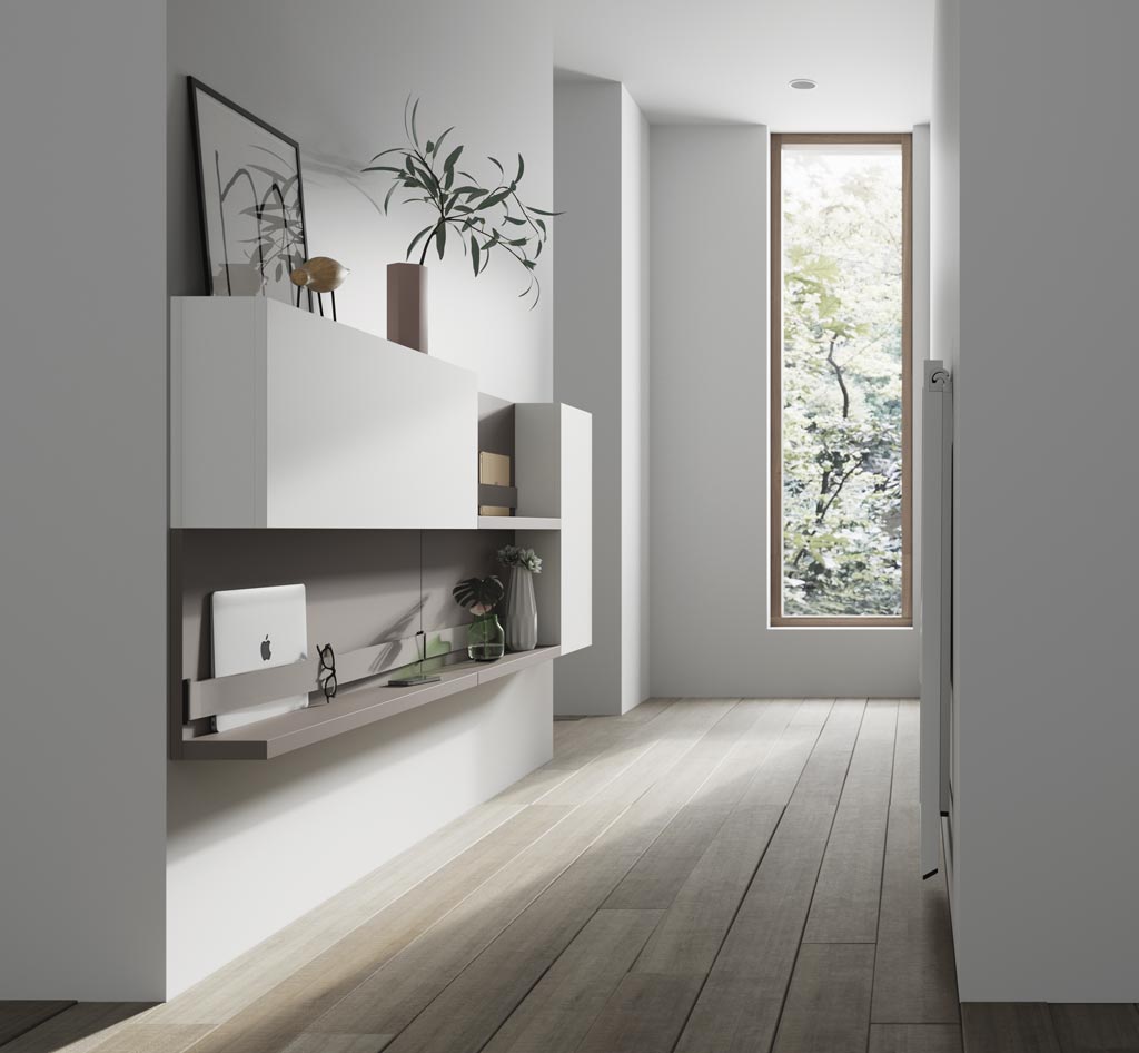 El módulo secreter plegable te permite tener una mesa estudio solo para cuando la tengas que utilizar, ya que cuando está cerrada no ocupa casi espacio.