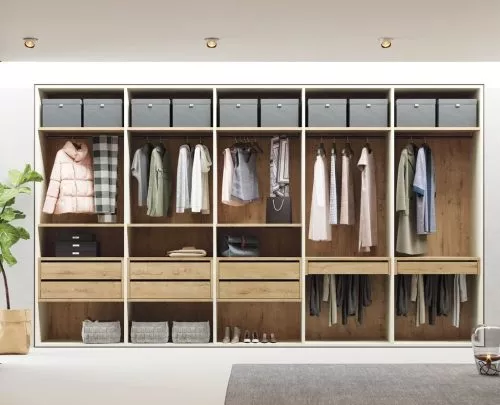 Este vestidor abierto está distribuido en dos paredes de cinco cuerpos cada una, en la pared de la izquierda tenemos una balda superior perfecta para guardar objetos o prendas que no se usan de manera habitual.