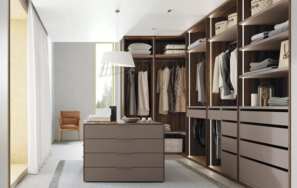 Un vestidor abierto con una isla central a juego y todo en orden